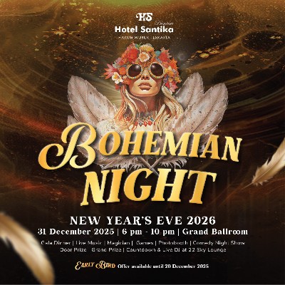 GAYATREND.com – Menutup tahun dengan penuh warna, Hotel Santika Premiere Hayam Wuruk Jakarta kembali menghadirkan perayaan malam tahun baru yang kali ini bertajuk “Bohemian Night”, pada 31 Desember 2025. Mengusung konsep yang berani, ekspresif, dan free-spirited, acara ini dirancang untuk memberikan pengalaman pergantian tahun yang meriah dan tak terlupakan bagi seluruh tamu.